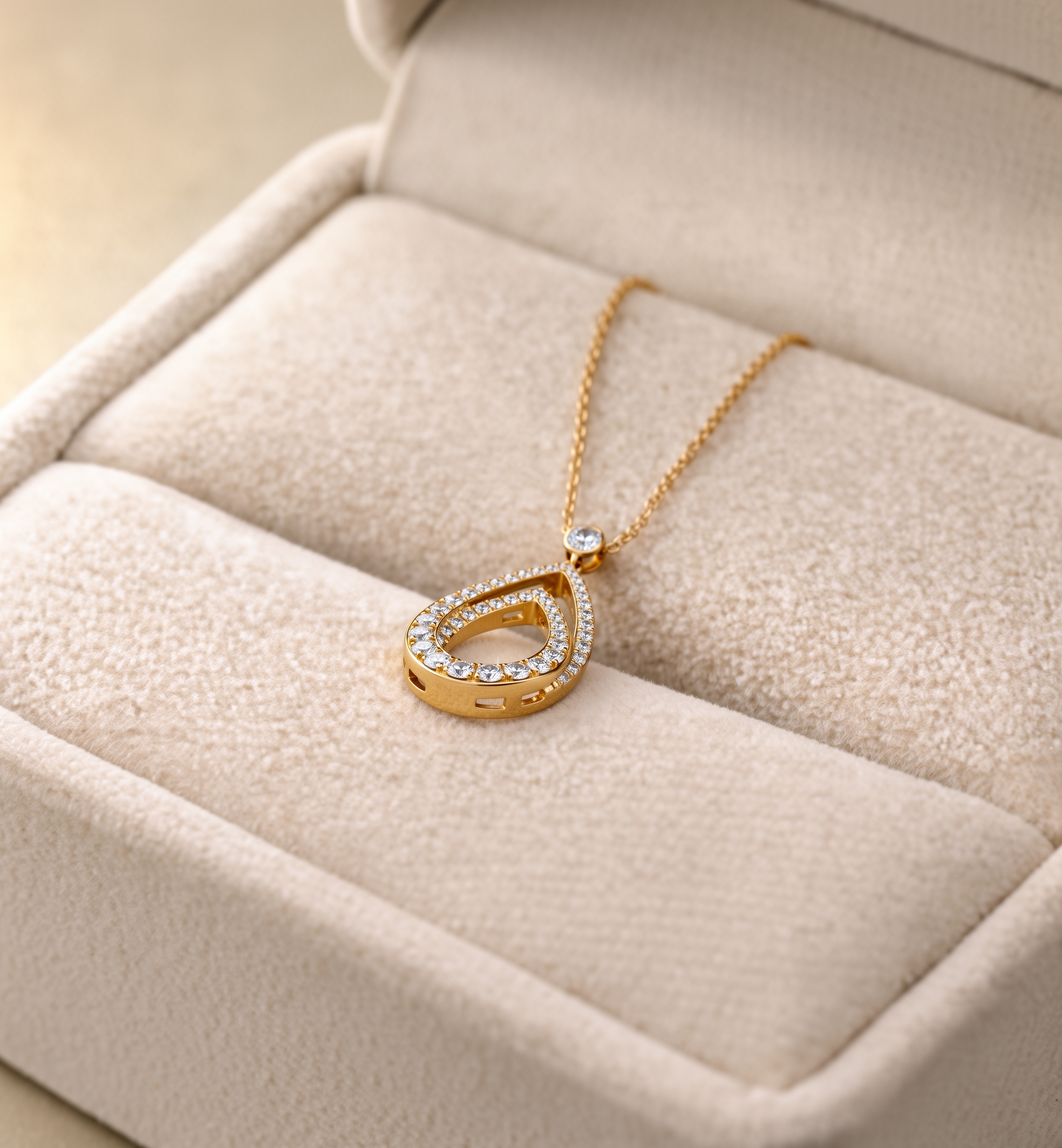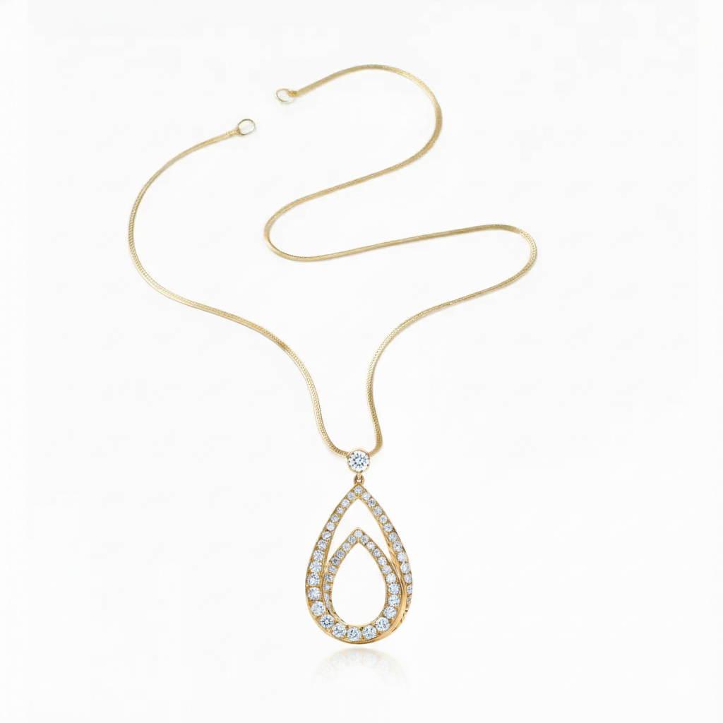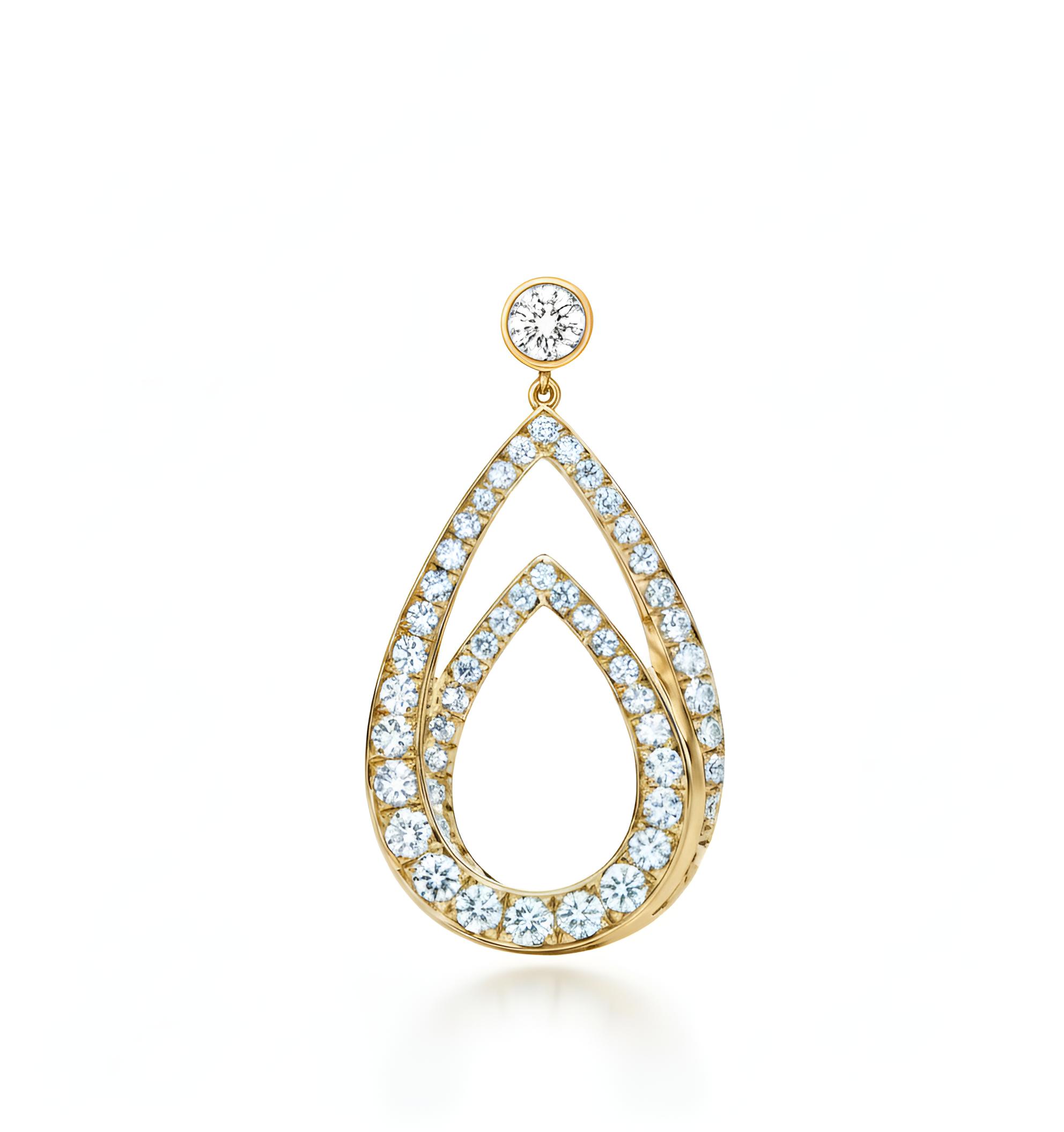 The jewelry features an elegant, openwork design consisting of two interlocking or layered teardrop silhouettes. The outer frame curves gracefully to meet an inner teardrop, creating a sense of fluid movement and depth.